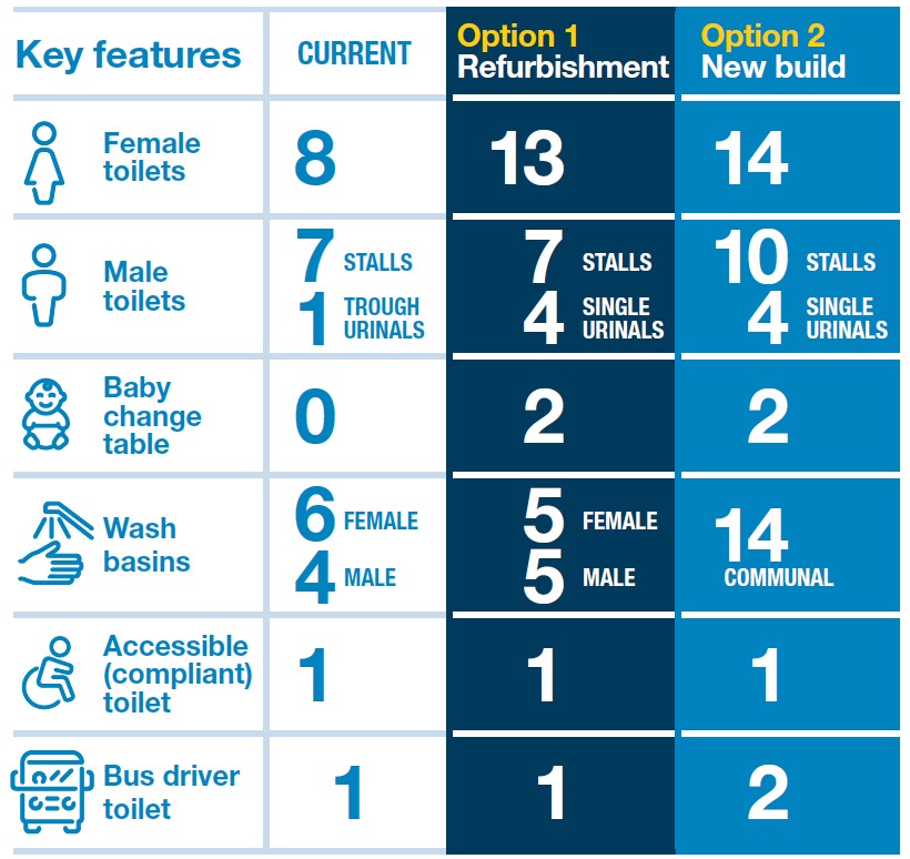- Increasing the amount of male and female toilet facilities